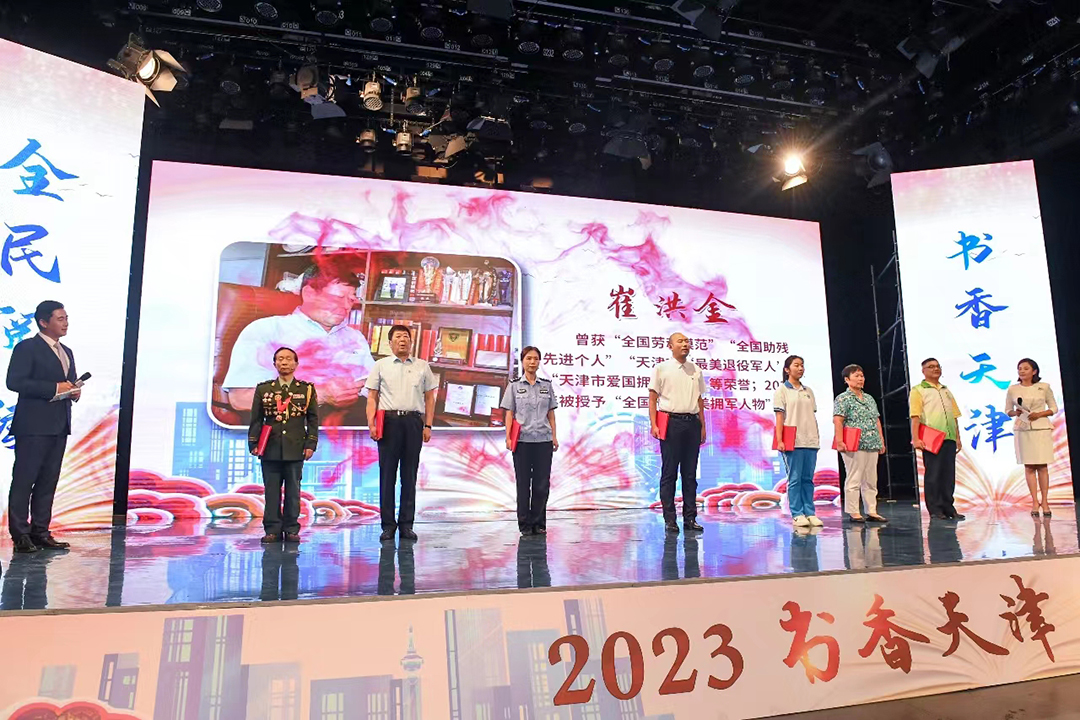 活動(dòng)由創(chuàng )意節目《千里江山圖》拉開(kāi)序幕,通過(guò)“奮進(jìn)·天津”“鄉土·天津”“科普·天津 ”“人文·天津”四個(gè)篇章,呈現書(shū)香天津·全民閱讀成果。在“奮進(jìn)·天津”篇章中,2023年被授予“全國十大最美擁軍人物”的崔洪金董事長(cháng)與其他嘉賓一起分別講述了自己關(guān)于閱讀的理解。